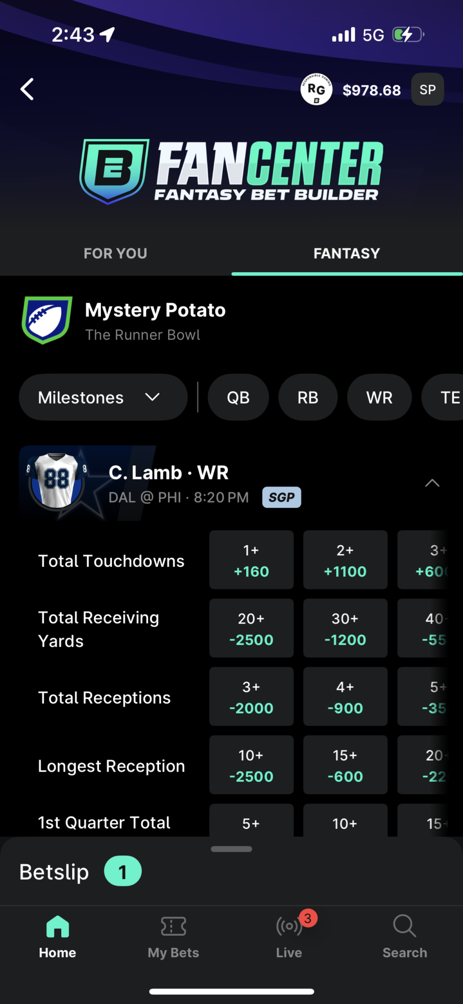 My favorite feature is the bet builder, which serves up your fantasy roster and allows you to expand the player to see prop bets related to that player.