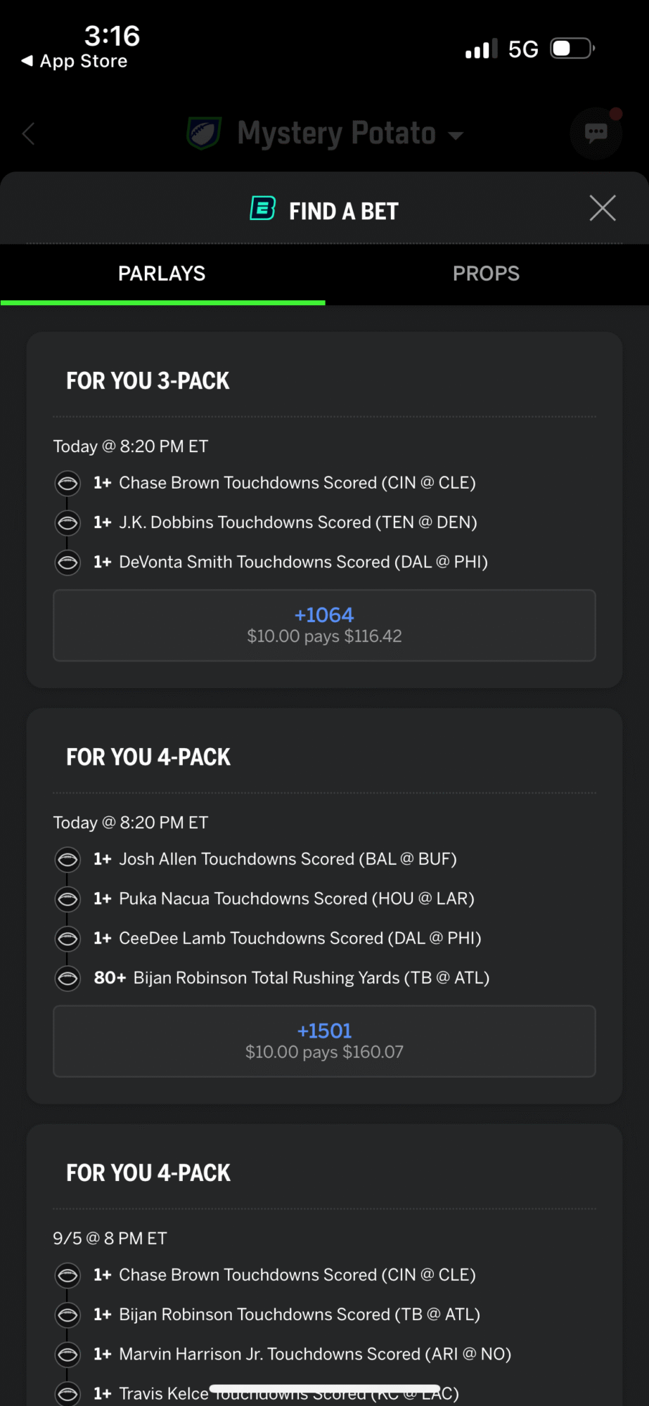 So I can take a CeeDee Lamb touchdown quickly, minimize his player card, then scroll down to Chase Brown and bet his receiving prop to start a parlay, or I can just bet them separately.
