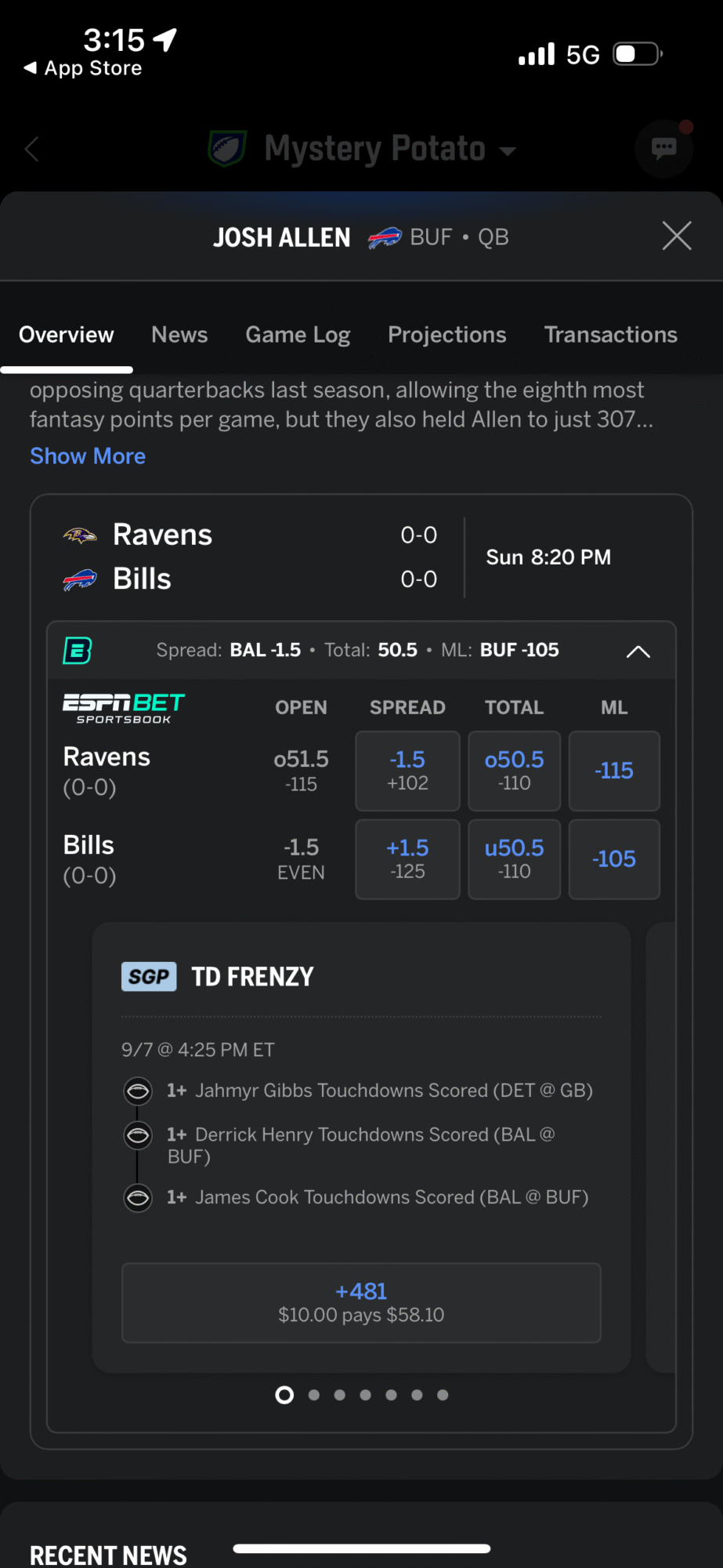In the ESPN Fantasy app, you'll now see more curated parlays based on your players when you click into their player profiles to get news and stats.